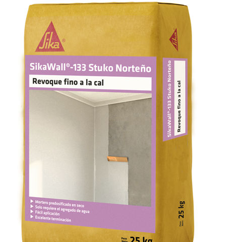 SikaWall®-133 Stuko Norteño es un mortero en polvo al cual solo se necesita incorporar agua para lograr en una sola capa de aplicación un revoque fino a la cal para ejecutar terminaciones exteriores, frentes y medianeras. Fabricado y premezclado en seco a partir de cemento, cal, y una curva granulométrica de arenas controladas, que logran una óptima calidad de terminación con mayor rapidez de aplicación.