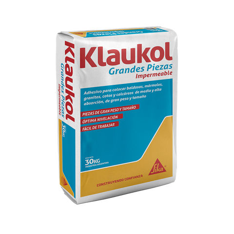 Klaukol Grandes Piezas® es una mezcla adhesiva impermeable, en base a ligantes hidráulicos y arenas de granulometría controlada, con alta adición de polímero,que le proporciona muy buena flexibilidad. Klaukol Grandes Piezas® està desarrollado para la instalación de baldosas, marmoles, granitos, cotos y calcáreos de media y alta absorcion grandes dimensiones y peso importante.
