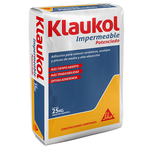 Klaukol Impermeable Potenciado® es una mezcla adhesiva en polvo de base cementicia, arenas de granulometría seleccionada, resinas sintéticas y aditivos especiales que garantizan una perfecta adhesión. Es una mezcla cremosa, elástica y homogénea. Los retenedores de agua aseguran el nivel justo de humedad permitiendo acomodar y facilitar el trabajo. Este producto, por poseer aditivos hidrófugos, otorga un plus de seguridad ya que reduce la permeabilidad de agua al minimo.
